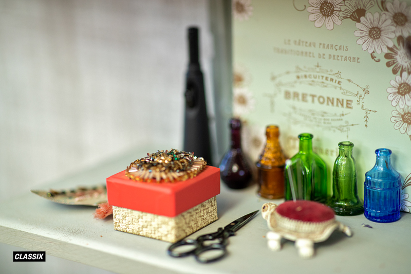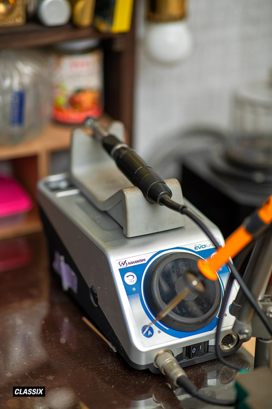 ▲写真左奥がジュエリーの加工スペース。さまざまな材料や工具、機械がならぶ小さな工場だ。作業に没頭している時でも、隣にある窓からお客さんの来訪にも気が付く。