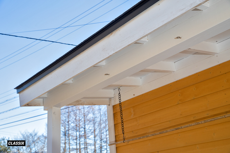 ▲外観は福杉を標準仕様とは異なる横張りにして仕上げている。屋根材は標準キットのアスファルトシングル。躯体は住宅と同じ2×4構造だ。