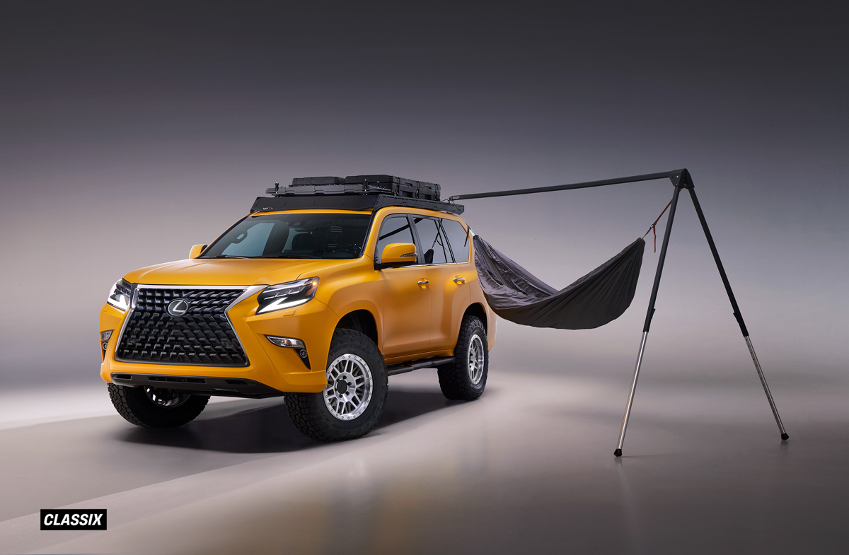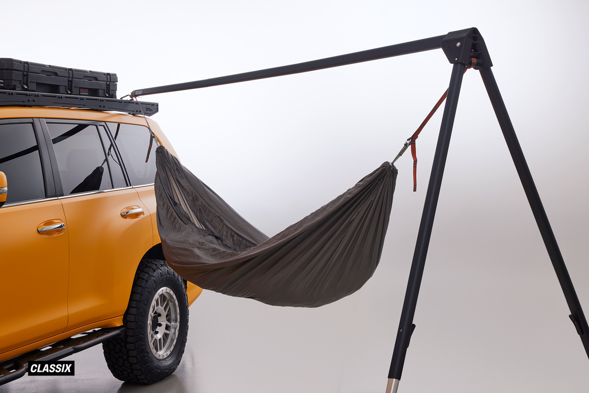 マットイエローサフランのラッピングで新装されたGX460は、カモック製オーバーランドハンモック&スタンドを、プリンス製のルーフラックに取り付けたピクニック仕様。