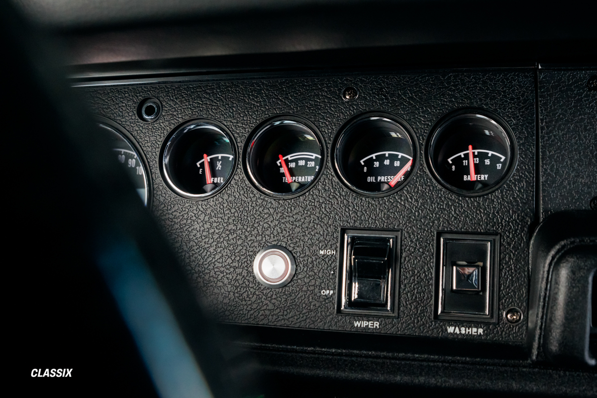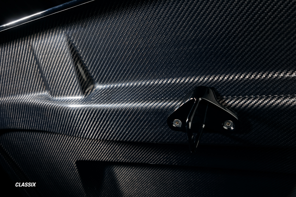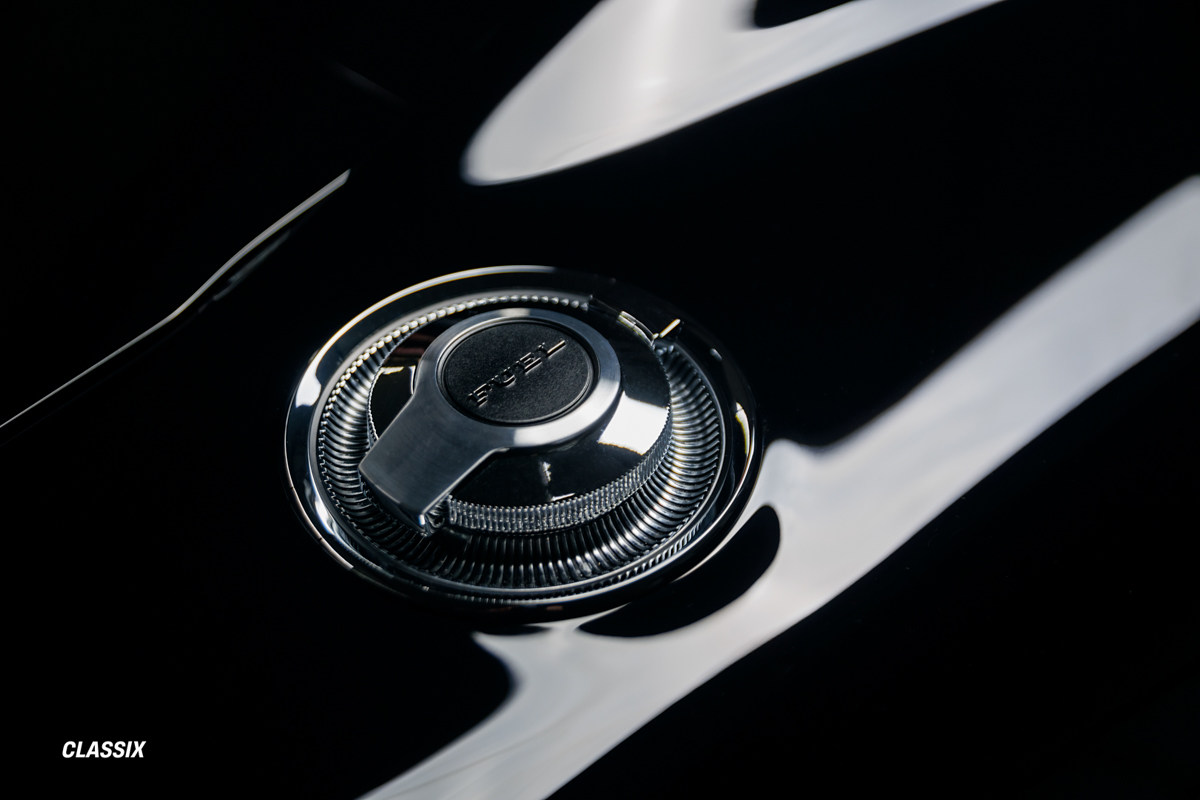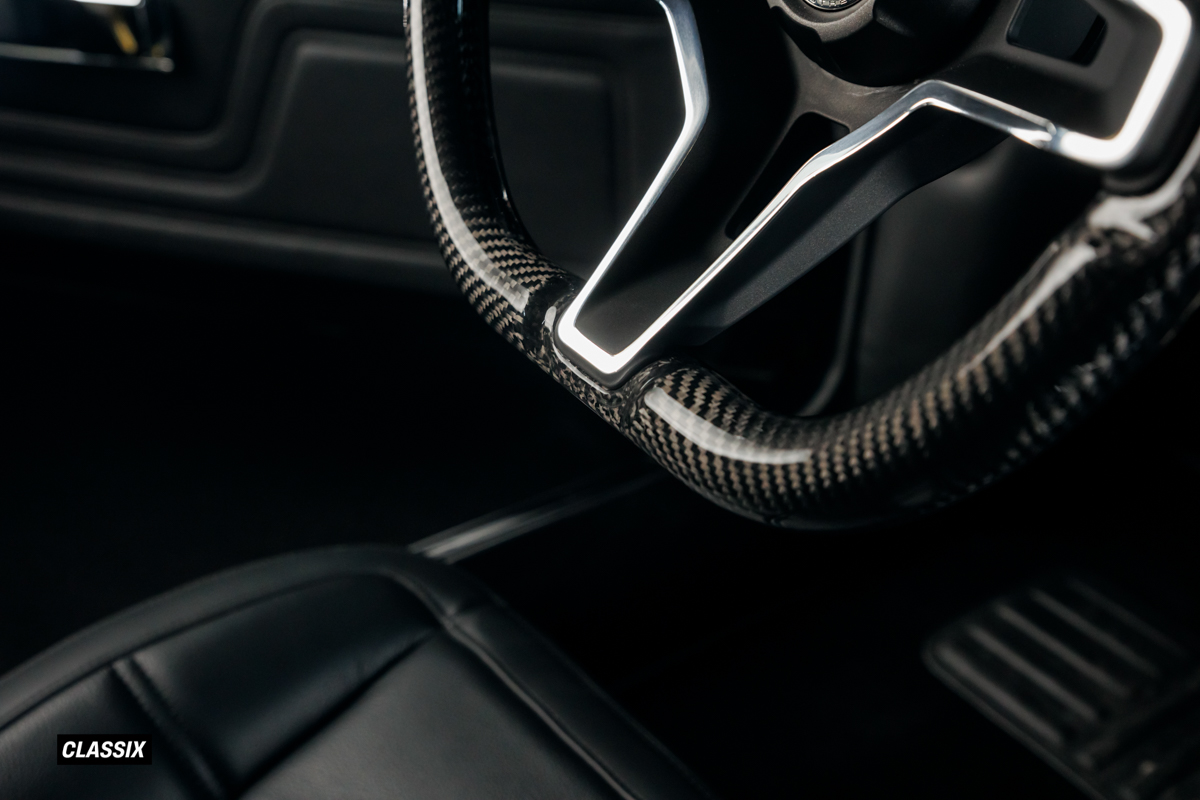 ▲内装はクラシックスタイルではあるが、装備類はすべてモダンにアップデート。コンソールはカーボンファイバー製とし、これにカスタムレザーインテリアを加えている。