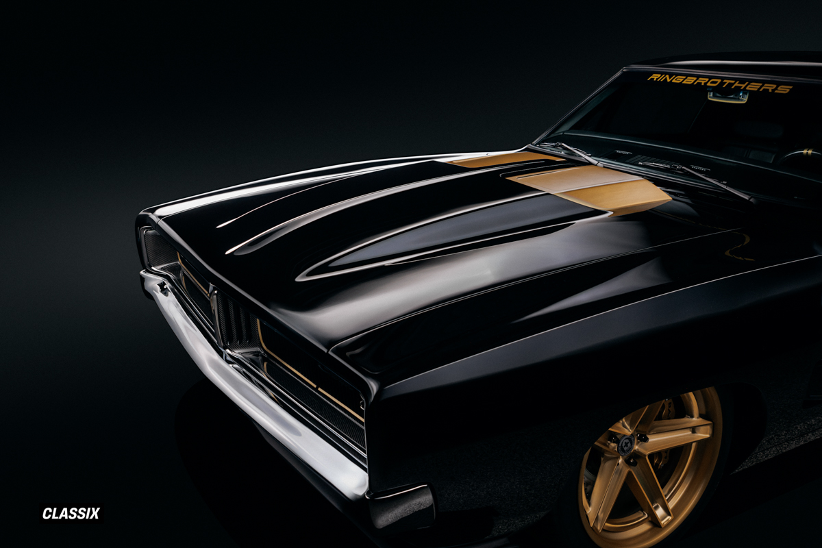 ▲リングブラザースの製作した1969年式ダッジ・チャージャー“タスク”。ペイントはBASF製塗料を使い、ブラックをベースにゴールドパートを組み合わせている。