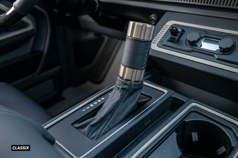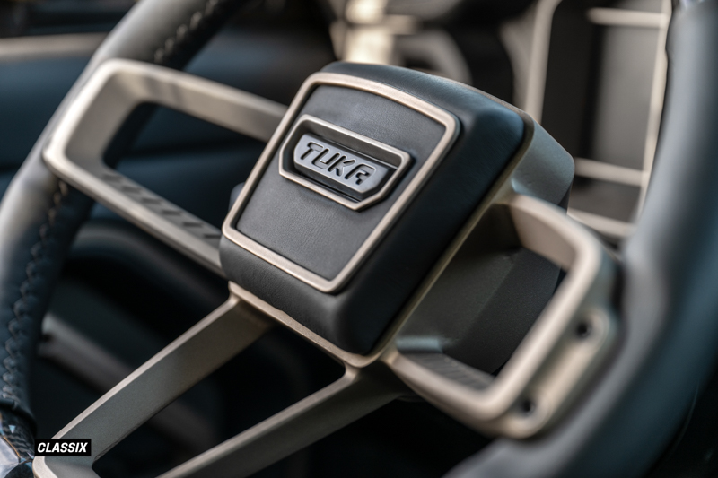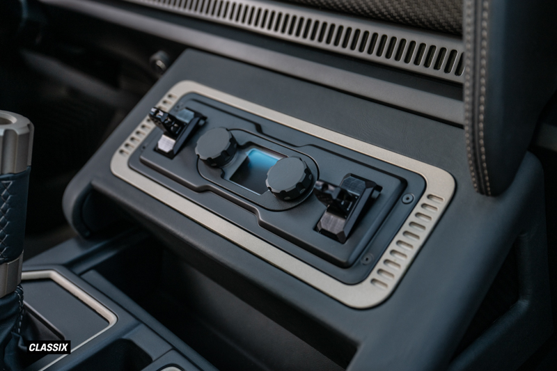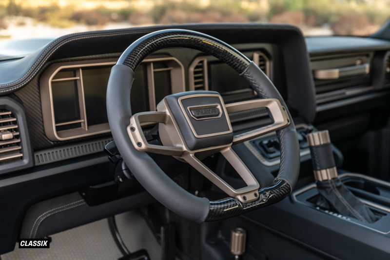カーボンファイバー製のダッシュボードにはDakota Digitalの計器類が配置され、ビレット加工や3Dプリントで製作されたスイッチ類、ギアセレクター、ハンドブレーキ、カーボンファイバー製のステアリングホイールが搭載されている。