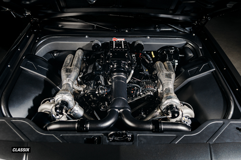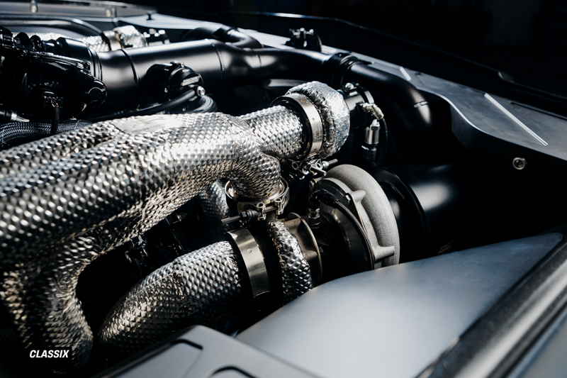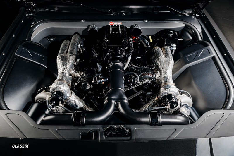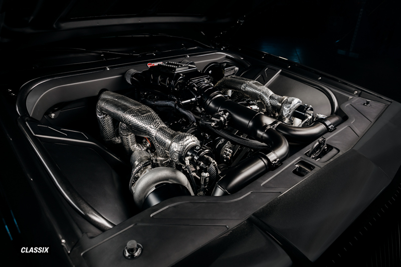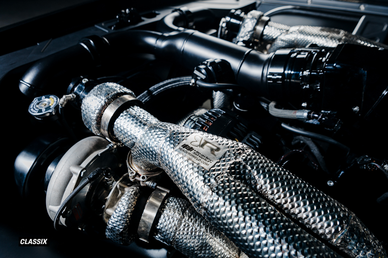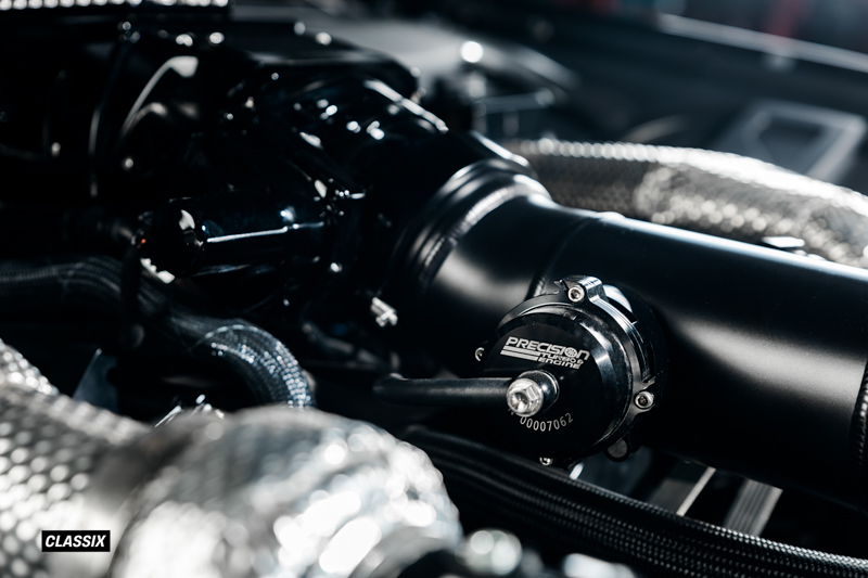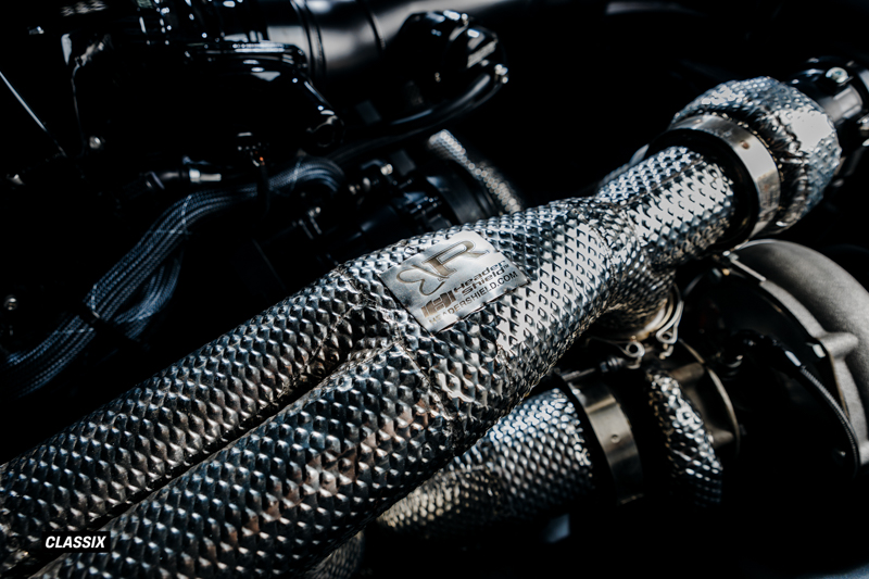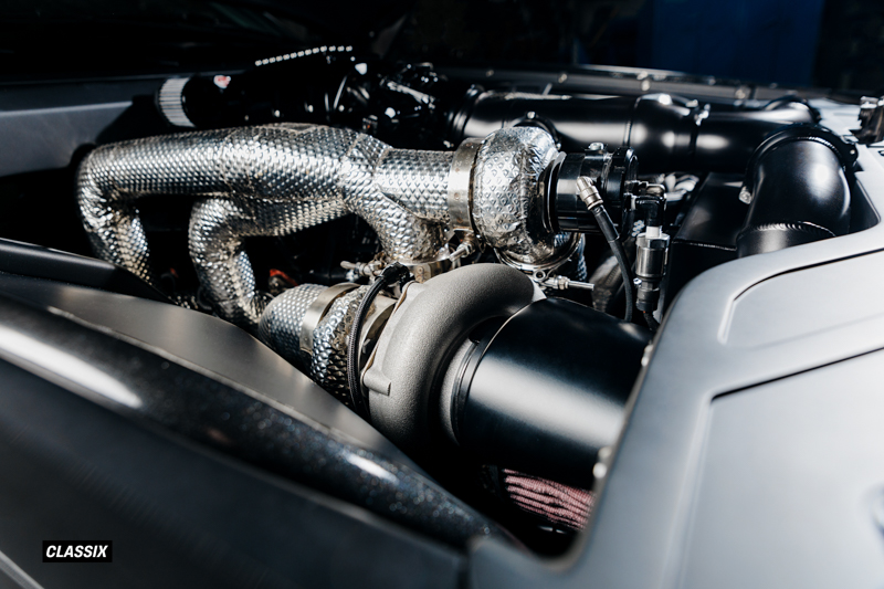 ターボチャージャーにはPrecisionのGEN2 62mmツインターボを採用し、シリンダーヘッドはTwisted 6 Racingが手作業でポート加工を施した特注アルミヘッドを使用している。