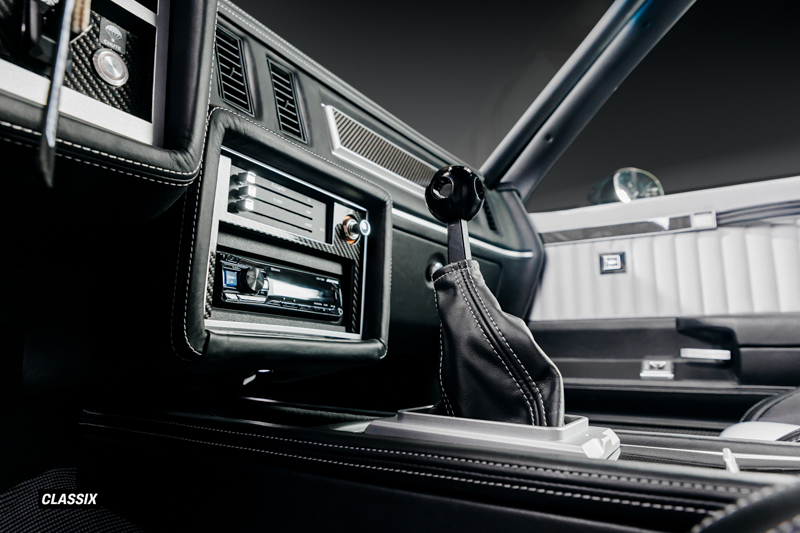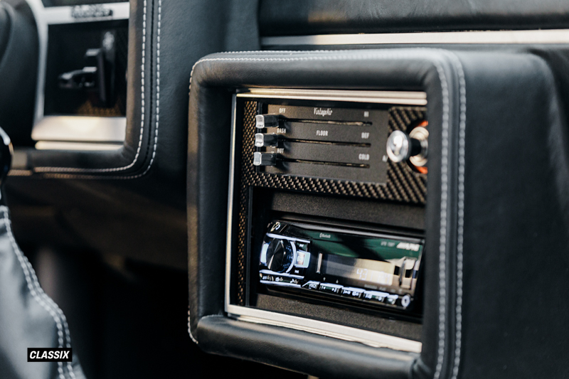 インテリアはUpholstery UnlimitedのSteve Pearsonによって一新されたもので、Dakota DigitalのカスタムインストルメントやRingbrothers製のプロトタイプステアリングホイールを採用。エアコンはVintage AirのGen IV Magnum Evaporator Kitをインストールし、快適な室内空間も実現している。