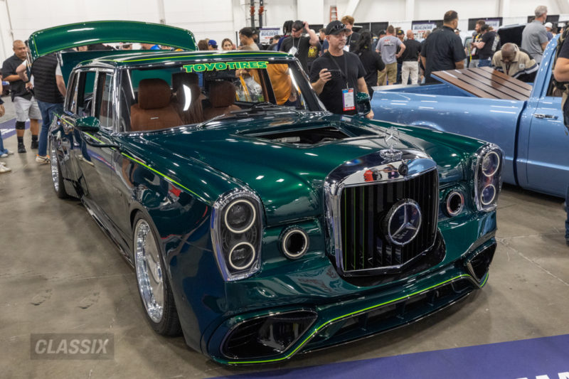 ▲1971年式メルセデス・ベンツ600プルマンは、最新のAMG S63eと1971年式のボディを組み合わせた意欲作。内装もS63から移植し、カーボンルーフやワンオフのボディキット、HREホイール、マクラーレン製テールなど、現代技術とクラシックの融合を極めている。