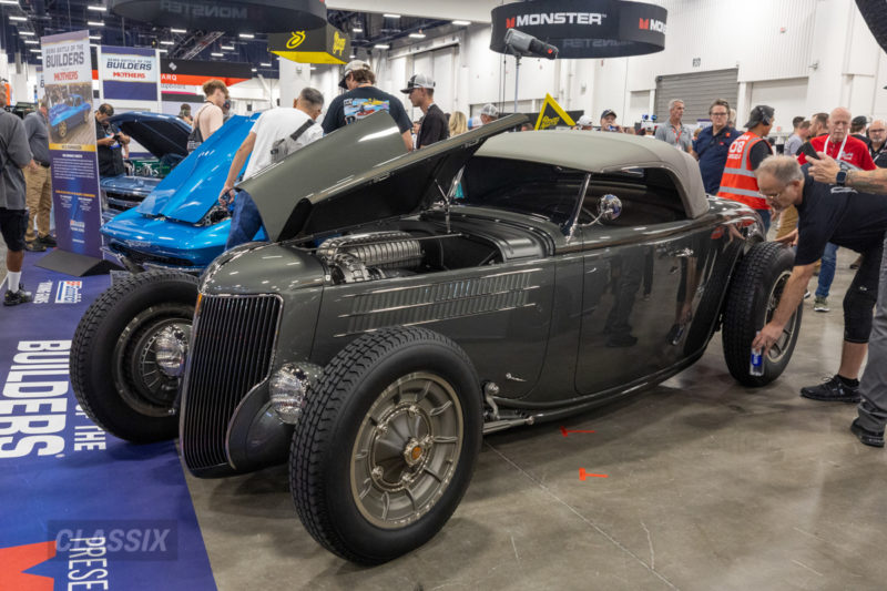 ▲カーデザイナーのTroy Trepanier(トロイ・トレパニア)による1936年式フォード・ロードスター。車体はハイボーイスタイル用に再設計。Rad Ridesが車体、シャシー、足まわりを手がけ、312cu.in.のスーパーチャージャー付きYブロックエンジンを搭載している。
