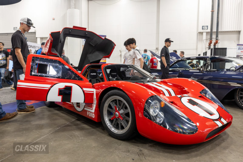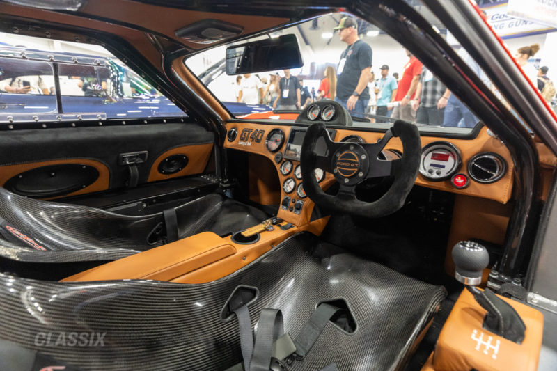 ▲写真上2点は共に伝説的な“ラグーンレッド”に彩られた1967年式フォードGT40 MKIV。パワーユニットにはフォード製コヨーテ5.0L V8ツインターボを搭載。カーボンシートやアルカンターラの内装など、見どころ満載だ。