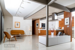 エリアの北側に建つエリザベス邸は、なだらかな傾斜地に建つ眺望に優れた家だ。購入時に全面的なリフォームが行なわれているが、アトリウムを中心にLDKを中央に大きく配置し、左右に小さめの個室を配置するなど、オリジナルの間取りがしっかりと生かされている。
