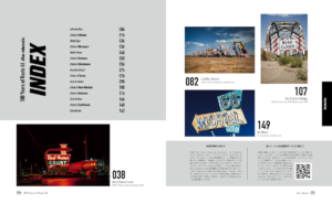 また、掲載スポットには外部地図情報サービスと連携させたQRコードも配置。スマートフォンで読み込むだけで、掲載スポットの正確な位置情報を確認でき、実際にルート66を旅する際にも便利に活用できます。ルート66ファンにとって、まさに決定版ともいえる一冊を、お手元でゆっくりとご覧ください。
