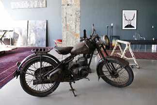 さらに、レトロなデザインのシンクや照明、無造作に立てかけられたミラーや放置されたイメージのバイクなどは、新オーナーの手によるデコレーションながら、まるで長い年月を共に過ごしてきたかのようにマッチしている。