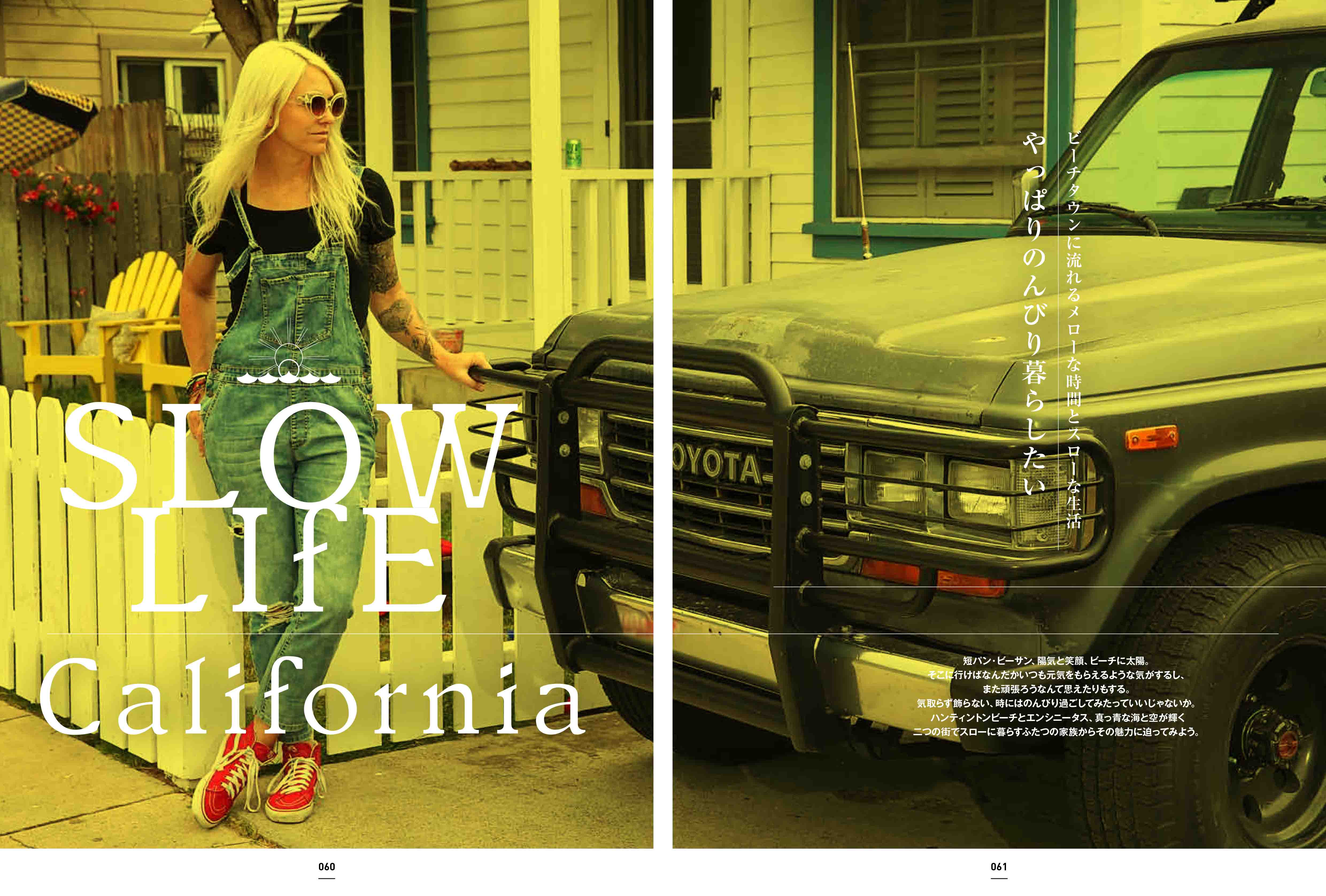 その他にも、美しいビーチタウンが多い南カリフォルニアでマイペースにのんびり暮らす「California SLOW LIFE」、これからの季節に活躍する街でもフィールドでも楽しめるファッションページ、クルマと遊びのスタイルを提案する「OFF TIME VEHICLE」の特集などまさに衣食住職食車が詰まった1冊となっています。