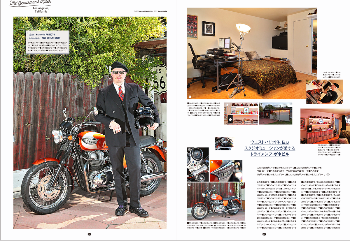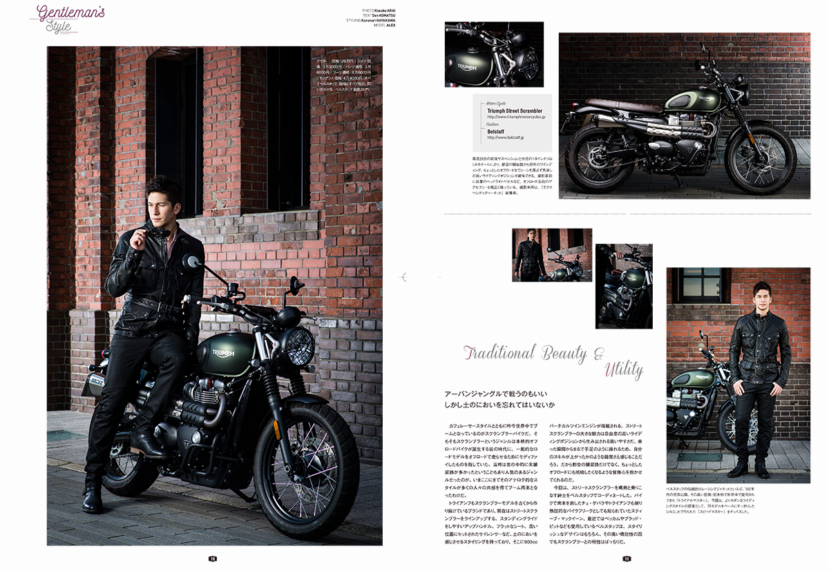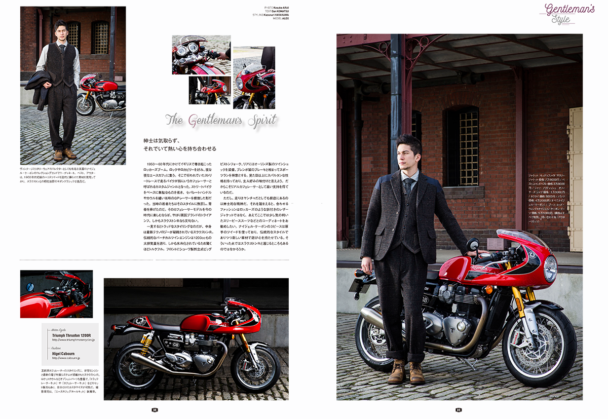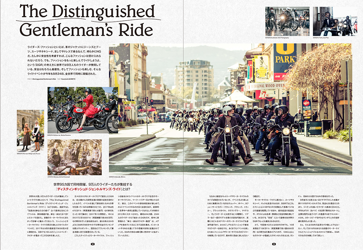 巻頭特集はジェントルマンズ・ライダース・ファッション。トライアンフ、ドカティ、スズキなど、最新のオートバイとファッションを提案しています。また、世界90か国以上で9万人が参加した『ザ・ディスティンギッシュド・ジェントルマンズ・ライド』からは、東京、ロンドン、ロサンゼルスの3拠点を中心に本誌だけの独自取材を実施。イベントに参加したおしゃれなジェントルマンズ・ライダーたちの中から、さらに8人の生活(家、ファッション、オートバイなど)を独自取材しています。