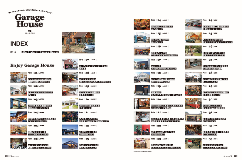 本誌『ガレージ・ハウス』はガレージだけではなく、ガレージのある住まい、またはガレージと住まいの区別があいまいな住居などをガレージ・ハウスと称し、日本国内はもちろん、カリフォルニア、ハワイ、ロンドンなど世界中のガレージ及びガレージ・ハウスの実例を合計33例収録した一冊です。